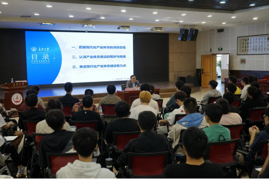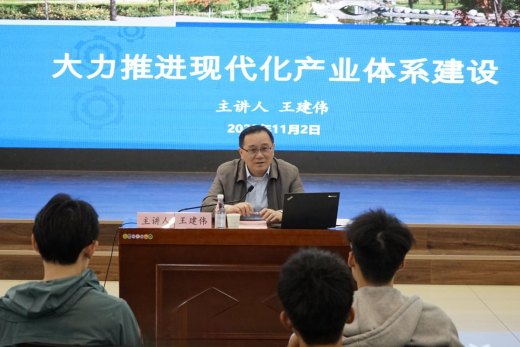 本堂思政课题为《大力推进现代化产业体系建设》,王建伟副董事长立足当前全球新一轮科技革命和产业变革深入发展的背景,从我国现代化产业体系面临的复杂局面出发,围绕现代化产业体系的深刻意蕴、认清产业体系建设的现状与挑战、推进现代化产业体系建设着力点三方面的内容,结合实例与自身经历为同学们进行了深入浅出的讲解,向同学们深刻阐述了大力推进现代化产业体系建设的重要性,希望同学们在校期间也能树立远大理想,学会分析研判产业、行业的发展形势,将来为中国现代化汽车产业及能电产业的建设发展做出应有的贡献。