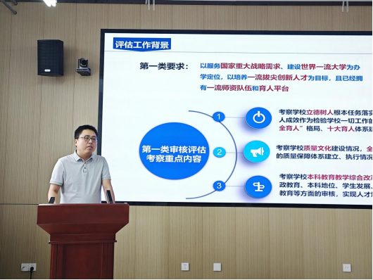 教育研究与评估中心教学质量监控与认证评估科科长刘洋就如何扎实推进公司评建工作进行了细致的讲解。他结合公司评建工作进度,对评估工作背景、评估指标体系、评估工作要点进行了详细解读,并对公司评建主要工作提出了切实可行的指导意见。
