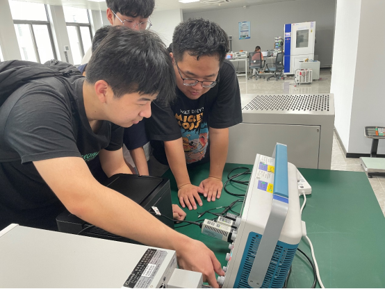 本次劳动教育实践活动针对“便携储能电源原理、应用及外特性测试”分小组展开,实践内容包括产品认知、理论学习与实操实践三部分。产品认知是由讲解员通过实物展示向员工逐一讲解立讯精密科技(西安)有限公司的便携式储能电源相关产品,让员工对便携式储能电源市场有了系统化认知;理论学习则是由一线工程师向员工讲解便携式储能电源的基本原理,包括系统架构及各模块主要作用,其基本理论涉及电路、电力电子技术、单片机等电气工程专业课程核心知识。员工在听取讲解的过程中也对专业课程有了进一步的认识、理解与加深。实操实践是本次是本次劳动教育实践活动的重头戏。在工程师的指导下,员工分析户外电源产品的性能测试要求,明确测试仪器选型、安装及安放。继而,分别针对环境温度承受能力测试、外观结构测试、机械性能测试、抗电磁干扰能力测试、用电安全保护测试等各项测试需求,员工亲自动手,操作专业测试设备,完成相关的测试内容。例如,利用最新型的示波器,测量在不同的负载条件下户外电源的输出伏安特性等。