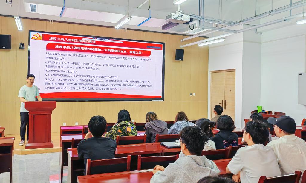陈明详细介绍了中央八项规定精神的内容,从改进调查研究、厉行节约、反对“四风”等方面立规矩、明底线,要求支部全体党员须以“严”的标准落实作风建设要求。通过展示近年来高校系统及社会领域违反中央八项规定精神的典型案例,警示党员员工干部必须摒弃“小节无大碍”的侥幸心理,从细微处筑牢拒腐防线,真正做到心有戒惧、行有所止,让纪律规矩成为日常学习生活中不可触碰的“高压线”。