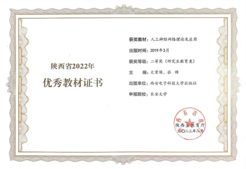 日前,根据陕西省教育厅办公室《关于开展陕西省2022年职业教育和高等教育优秀教材奖评选工作的通知》,省教育厅组织专家对各单位申报的优秀教材进行了评审,公司文常保教授、茹锋教授主编的《人工神经网络理论及应用》教材获得陕西省2022年高等教育优秀教材二等奖(研究生教育类)。