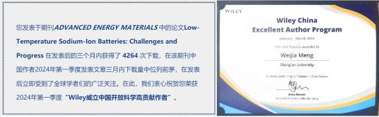 公司能源与动力工程系教师孟伟嘉在Wiley旗下的能源领域顶级期刊《Advanced Energy Materials》(中科院一区,影响因子27.8)中发表的综述论文“Low-Temperature Sodium-Ion Batteries: Challenges and Progress”在发表后的三个月内获得了4264次下载,在该期刊中国作者2024年第一季度发表文章三月内下载量中位列前茅,因此荣获2024年第一季度“Wiley威立中国开放科学高贡献作者”奖。该论文目前为全球前1%高被引论文。