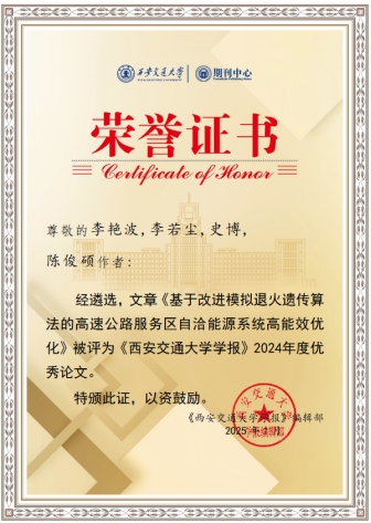 365英国上市官方网站李艳波教授以第一作者身份在《西安交通大学学报》上发表的题为《基于改进模拟退火遗传算法的高速公路服务区自洽能源系统高能效优化》的研究论文,被评为2024年度优秀论文。