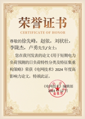 365英国上市官方网站徐先峰教授以第一作者身份在《电网技术》上发表的题为《用于短期电力负荷预测的日负荷特性分类及特征集重构策略》的研究论文,被授予“2024年度高影响力论文”称号。