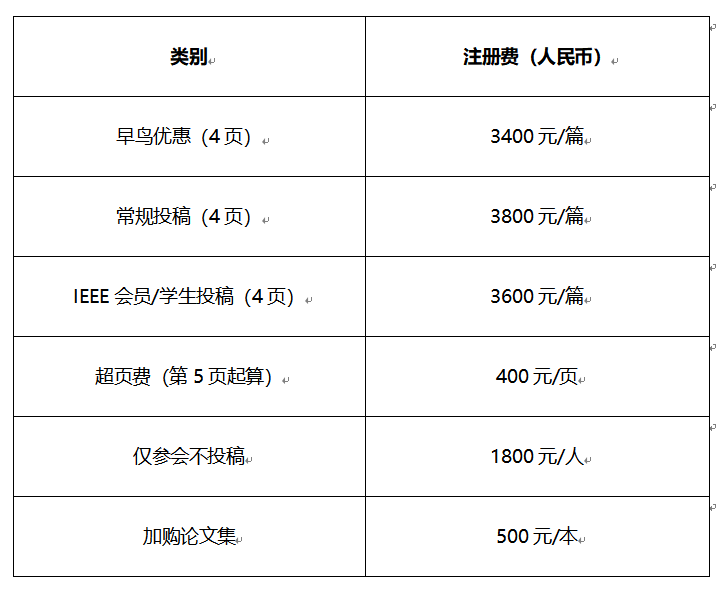 (4)每篇投稿论文含一个免费参会名额和一本纸质版会议论文集,会议注册费包括茶点、会议礼包及纸质资料,但不包括住宿与交通费。