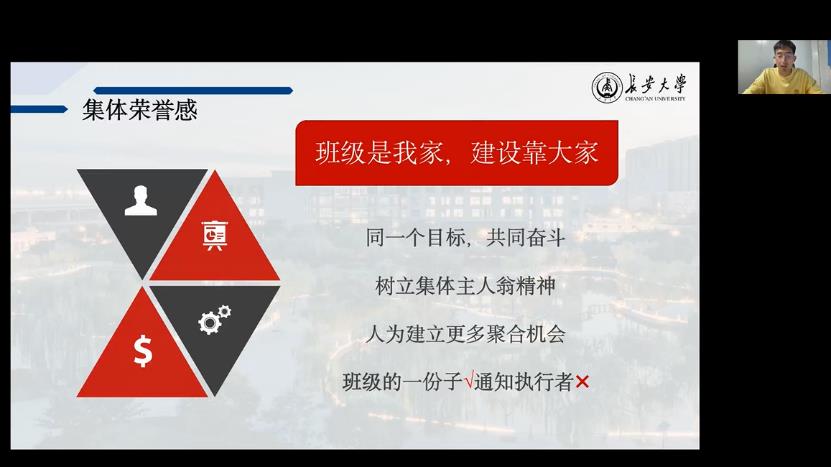 在班会上,马家骕介绍了班级总体情况,并对标文明班集体建设提出了相应的班级发展计划。班级引领之星获得班级负责人马勇生从班级基本情况,获得成果,班级建设经验以及如何处理好个人和集体之间的关系等方面对和谐班集体建设进行了经验分享。他讲到要善用团日活动、重要时间节点开展好思想引领、学风建设等活动促进班级建设,给大学留下珍藏回忆。