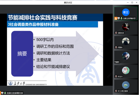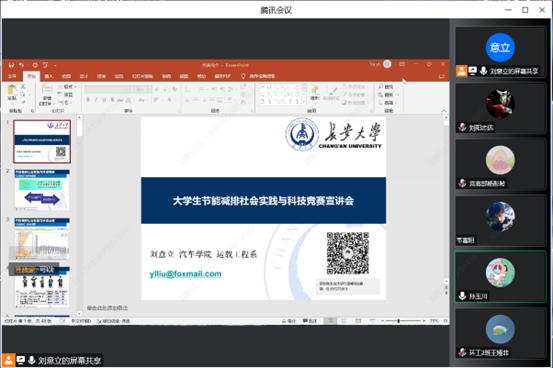 宣讲会开始后,刘意立老师介绍了“老员工节能减排社会实践与科技竞赛”的比赛背景、举办时间和地点、比赛规则与参赛选题等详细信息。随后刘意立老师讲解作品申报材料如说明书、申报书、图形摘要及展示视频等材料的准备工作,强调调研方式、数据统计、作品展示以及项目答辩重要性,并展示往届参赛优秀作品案例。