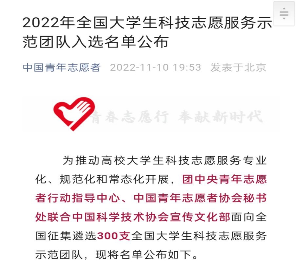 为深入贯彻落实习近平总书记关于科普工作的重要讲话精神,推动高校老员工科技志愿服务专业化、规范化和常态化开展,团中央青年志愿者行动指导中心、中国青年志愿者协会秘书处中国科学技术协会宣传文化部联合面向全国征集遴选300支全国老员工科技志愿服务示范团队。