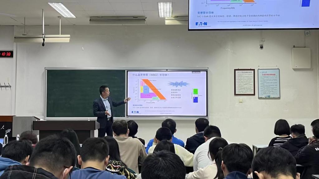 郑大为从寿命、经济性、可用性等方面分析了储能变流器的发展方向,并讲述了电力电子技术行业的发展机会。他在讲座中着重介绍了半导体器件,包括半导体器件的热阻模型、损耗平衡分析、应用以及IGBT器件的安全工作区,为同学们讲述了零碳数据中心以及数据中心基础供电设施的发展和组成,并着重分享了储能变流器应用于新型电力系统,支撑“双碳”目标的重要作用。