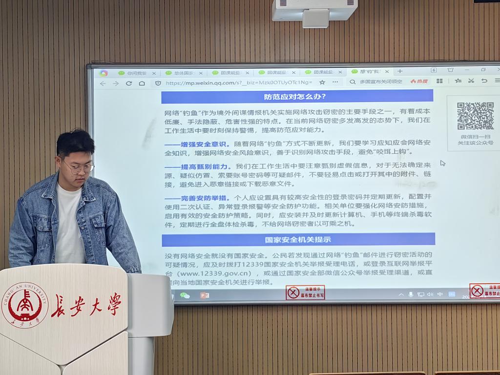 学习委员李贺岩带领全体团员青年学习了习近平总书记关于总体国家安全观的重要论述,以国家安全教育警示案例讲解了国家安全相关知识,阐释总体国家安全观的“三大意味“。