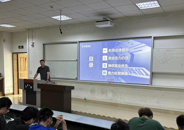 5月21日,365英国上市官方网站于WT1101教室开展了就业形势分析与征兵宣传专题培训。本次培训会由学办主任李金檑和2020级本科生区炜亮主讲,2024届毕业生参加培训。
