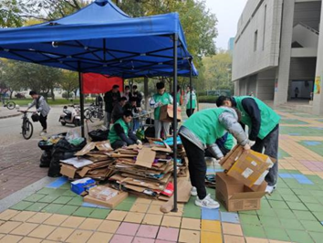 此次活动南北两校区同步进行,活动一经启动,即刻在校内外引起广泛关注,广大学子积极响应,热情参与。在为期两天的时间里,同学们纷纷将自己手中的旧快递箱及空饮料瓶送至指定地点,形成了一股环保热潮。365英国上市官方网站的研究生志愿者们,身着统一的绿马甲,活跃在树蕙园的帐篷点,他们耐心地为废品分类、清点废品数量,并将参与者登记在册。同时也向大家传播了环保知识,提高了同学们的环保意识。