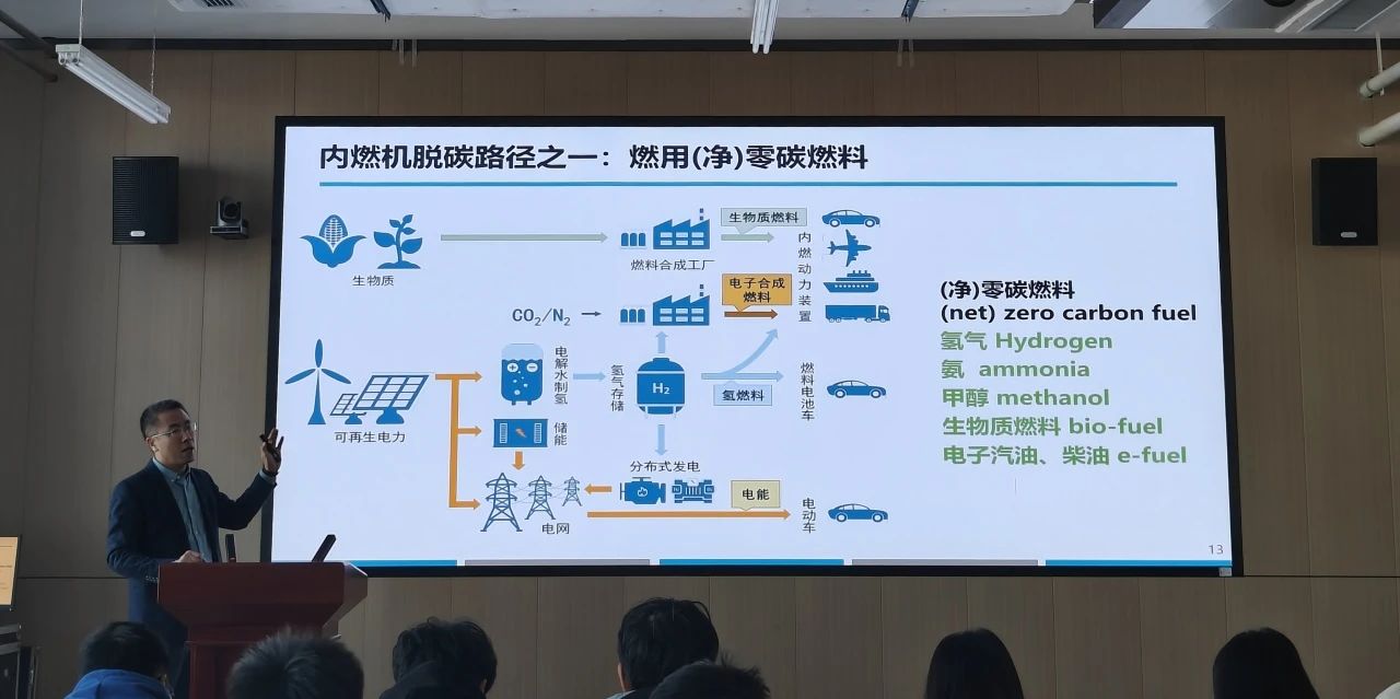 此外,刘海峰研究员细致解读了造林复林、生物能源碳捕集与封存、直接空气捕集等多元碳移除技术。这些技术为实现内燃机低碳排放开辟了多条创新路径,极大地激发了在场师生的思维火花,让大家深受启迪。最后,刘海峰教授与在场同学们探讨了燃料与发动机协同优化的理论与技术,并针对未来碳中和内燃机的发展进行了展望。