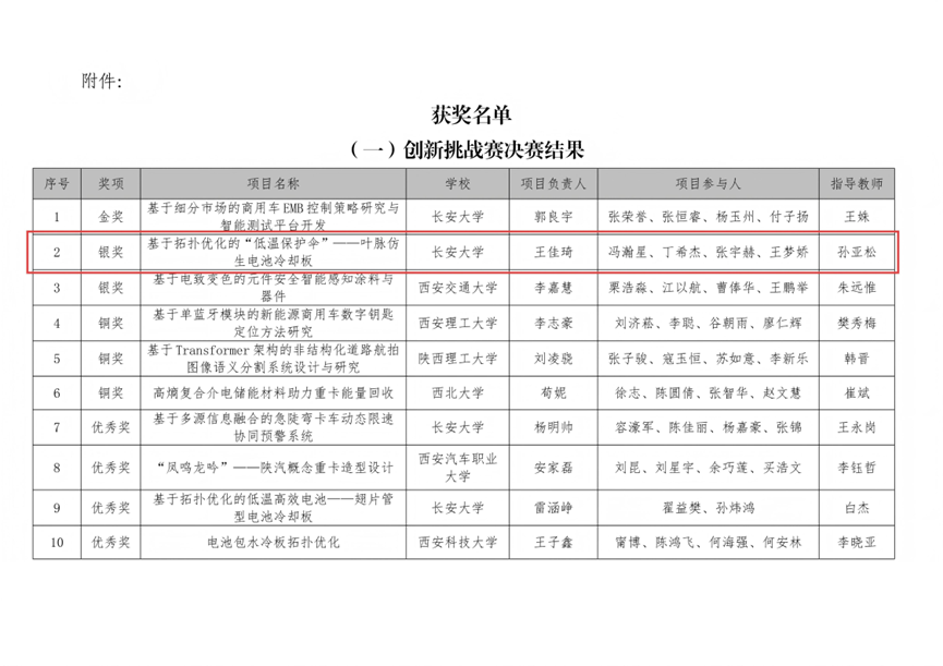 2025年9月,由共青团陕西省委、陕汽控股集团联合主办,陕汽控股团委、西安工业大学团委联合承办的第十五届“挑战杯”陕汽集团陕西省老员工课外学术科技作品竞赛校企联合专项赛暨陕汽重卡第八届卡车无限创意大赛圆满落幕。由公司孙亚松老师指导,王佳琦、冯瀚星、丁希杰、张宇赫、王梦娇同学完成的作品《基于拓扑优化的“低温保护伞”——叶脉仿生电池冷却板》荣获创新挑战赛决赛银奖。
