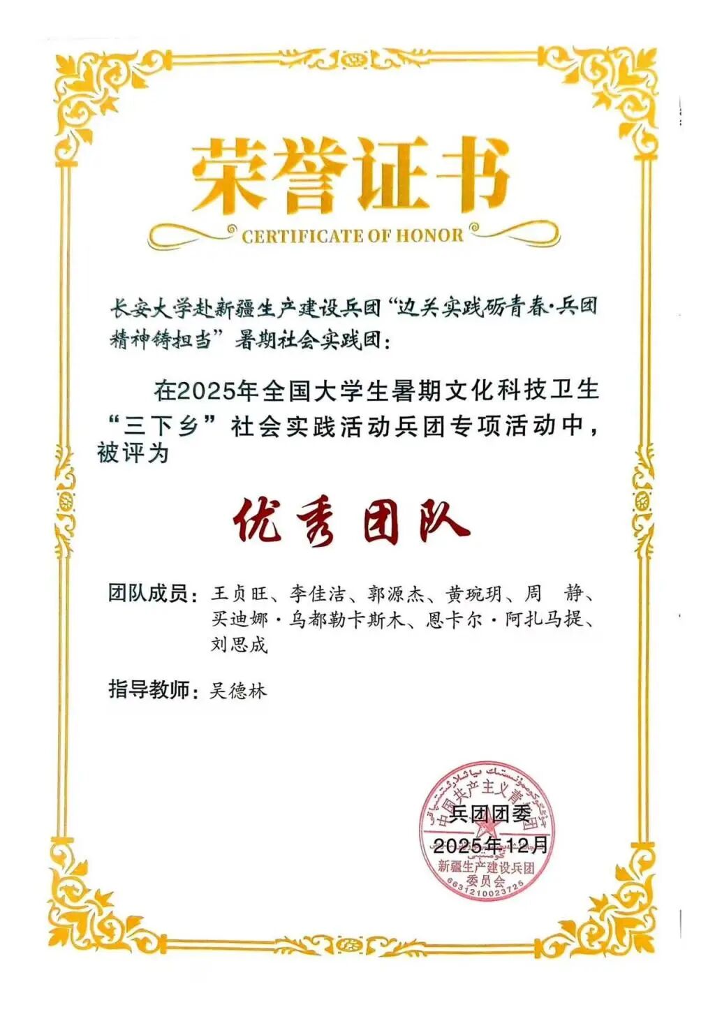 365英国上市公司赴新疆生产建设兵团“边关实践砺青春·兵团精神铸担当”暑期社会实践队。实践团队以传承兵团精神为核心,先后走访新疆生产建设兵团军垦博物馆、第五师双河市各边境哨所、阿拉山口国门等15个核心实践点位,完成《新时代兵团精神的传承现状及青年弘扬路径探索——基于新疆生产建设兵团第五师双河市的考察》等4篇调研报告,设计“兵团精神文创套装”,发布校级以上新闻稿19篇,构建了“历史追溯+实践体悟+文化传播+育人宣讲”四维融合的实践新范式,推动课堂学习与边疆实践深度融合,让青年学子在行走的思政课堂中锤炼过硬品格、践行青春担当。