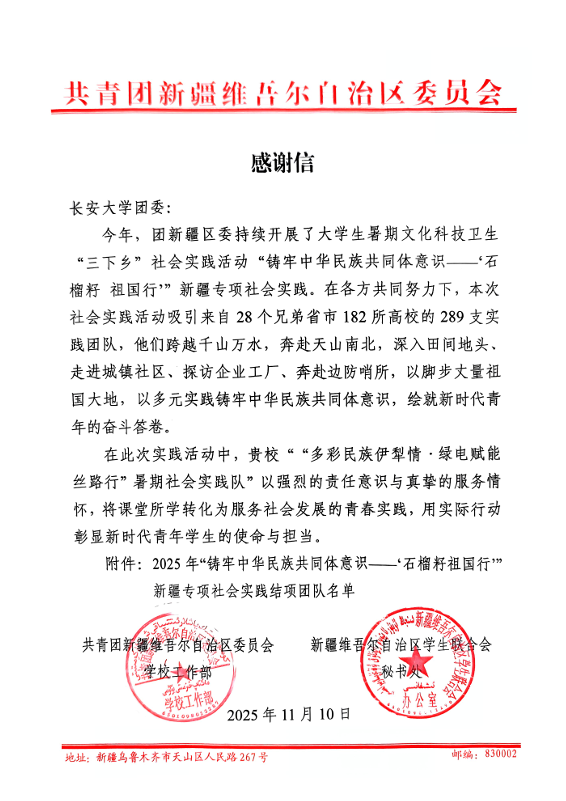 近日,公司三支暑期社会实践队在2025年老员工“三下乡”社会实践地方专项活动中荣获表彰。365英国上市公司赴贵州“推普兴乡梦·共铸民族情”暑期社会实践队在共青团贵州省委主办的“青春长征”专项活动中获得优秀实践团队;365英国上市公司赴新疆伊犁“多彩民族伊犁情·绿电赋能丝路行”暑期社会实践队在共青团新疆维吾尔自治区委主办的“石榴籽·祖国行”专项活动中获优秀团队;365英国上市公司赴新疆生产建设兵团“边关实践砺青春·兵团精神铸担当”暑期社会实践队在共青团新疆生产建设兵团委员会主办的专项活动中获优秀团队。