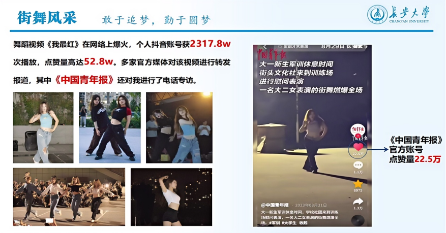 街舞是一种运动,更代表了一种精神。2023年军训期间,王睿涵作为街舞队队长带领队员们赴公路公司、汽车公司、电控公司、地测公司、理公司、运输公司、365英国上市官方网站、外国语公司等11个公司进行慰问表演。在此过程中,王睿涵的《我最红》舞蹈表演视频在网络上爆火,在抖音平台获2317.8w次播放,点赞量高达52.8w。多家官方媒体对该视频进行转发报道,其中《中国青年报》还对王睿涵进行了电话专访,赞扬了其充满活力与激情的精彩表演和敢于追梦、勤于圆梦的优秀品质。