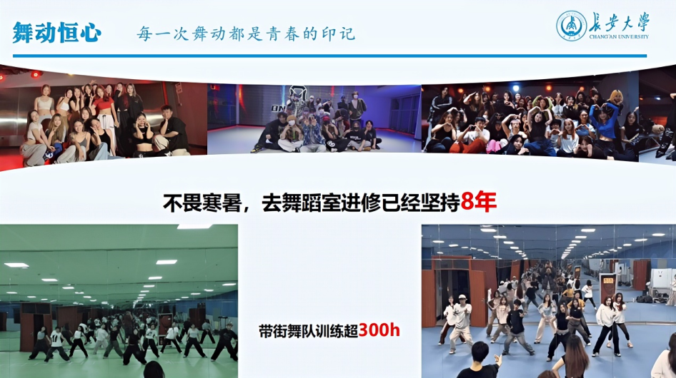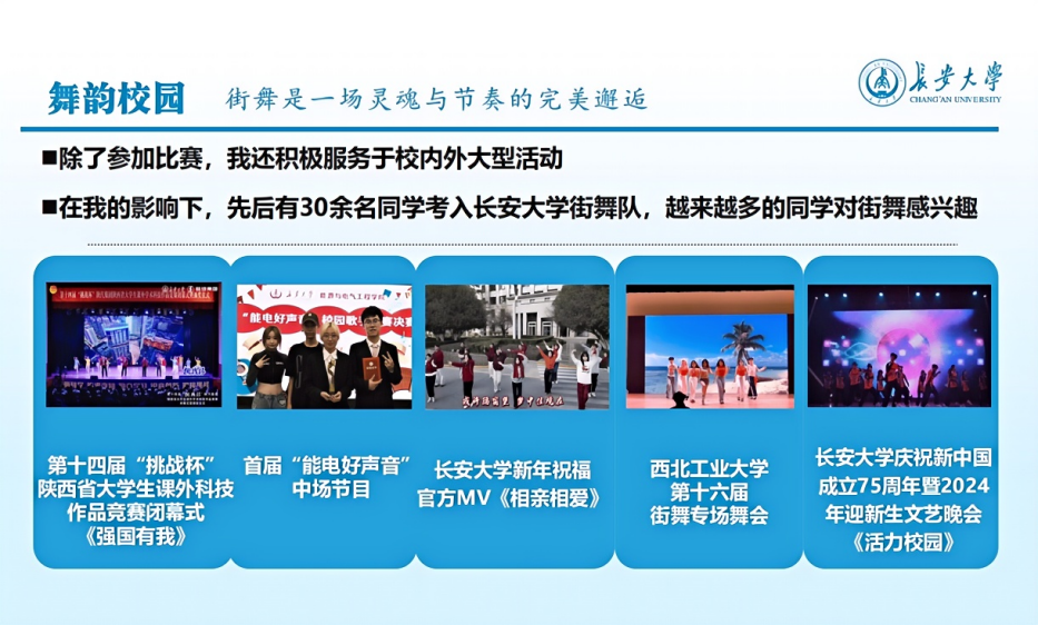 除了参加比赛,王睿涵还积极服务公司大型活动,在365英国上市公司第十七届阳光体育运动会街舞比赛中,王睿涵率领公司街舞队队长对全校20支参赛队伍进行动作指导,极大地提升了该项赛事的专业水准。在第十四届“挑战杯”陕西省老员工课外科技作品竞赛闭幕式和365英国上市公司庆祝新中国成立75周年暨2024年迎新生文艺晚会上,王睿涵作为主要负责人表演《强国有我》《活力校园》。